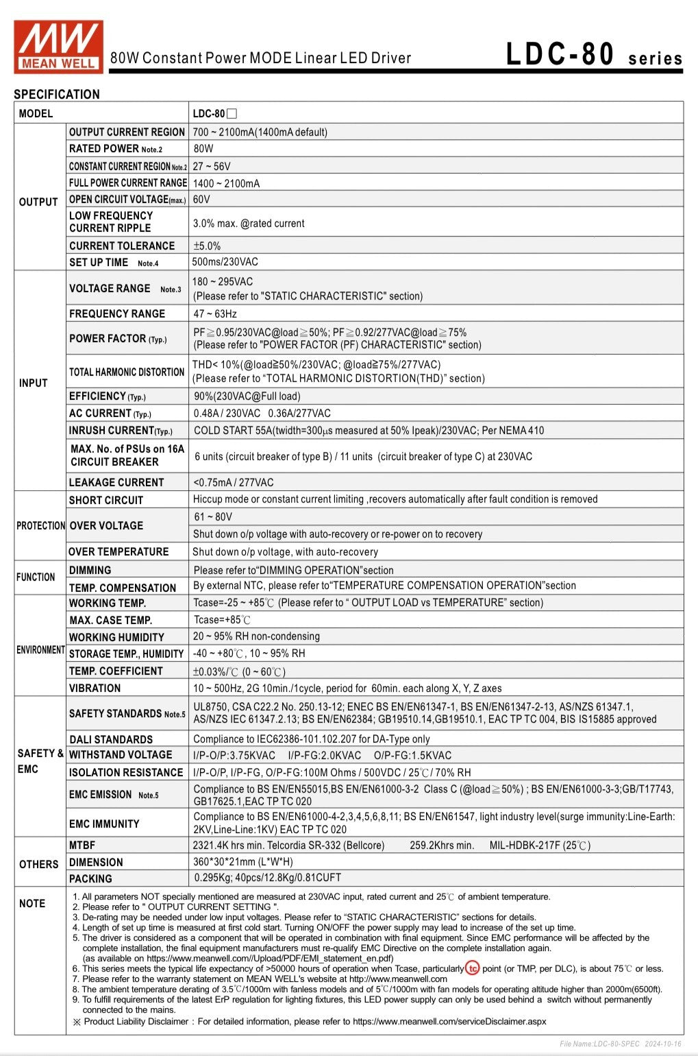 MEAN WELL LDC-80DA 80W CONSTANT POWER DIMMABLE LED DRIVER 700mA - 2.1A fd****