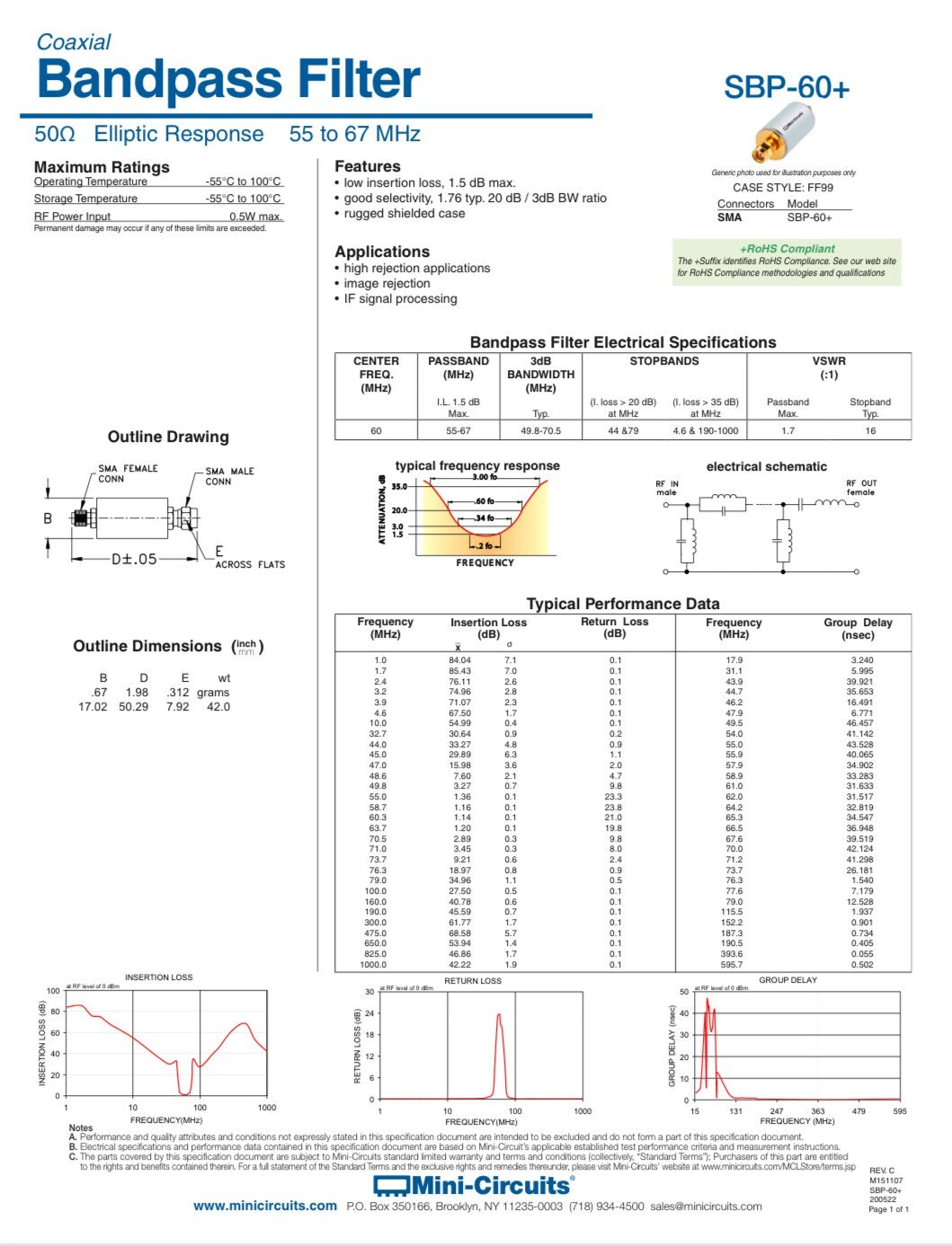 MINI-CIRCUITS SBP-60+ SMA LUMPED LC BAND PASS FILTER 55 - 67MHz AE1W54