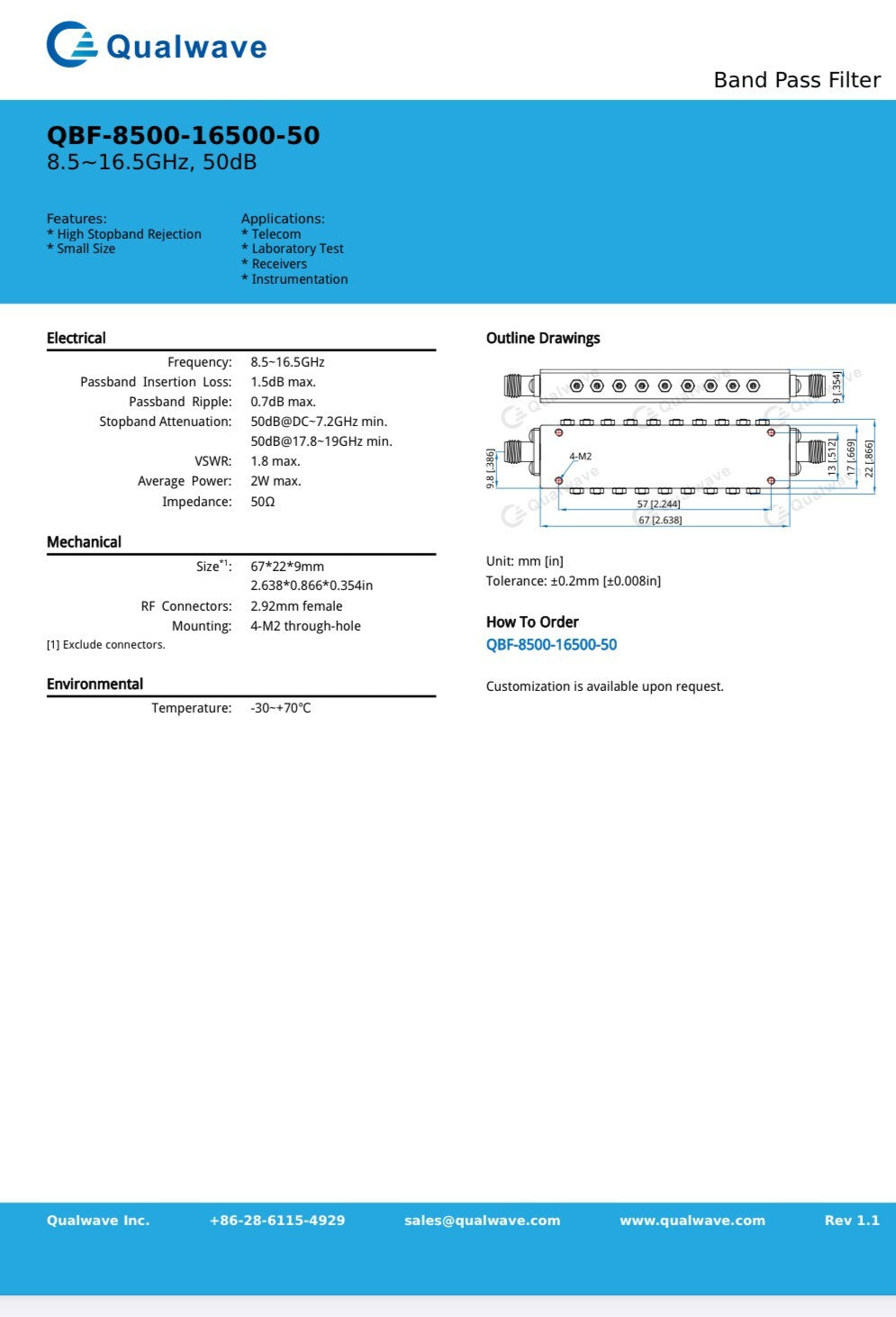 QUALWAVE 8.5GHZ - 16.5GHZ 2W BAND PASS FILTER 2.92MM CONNECTORS AE1W86