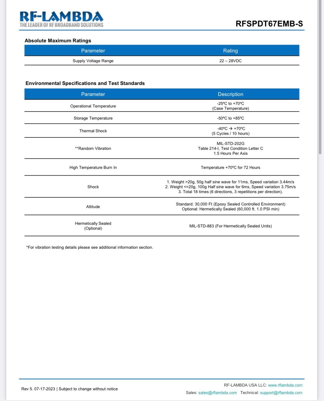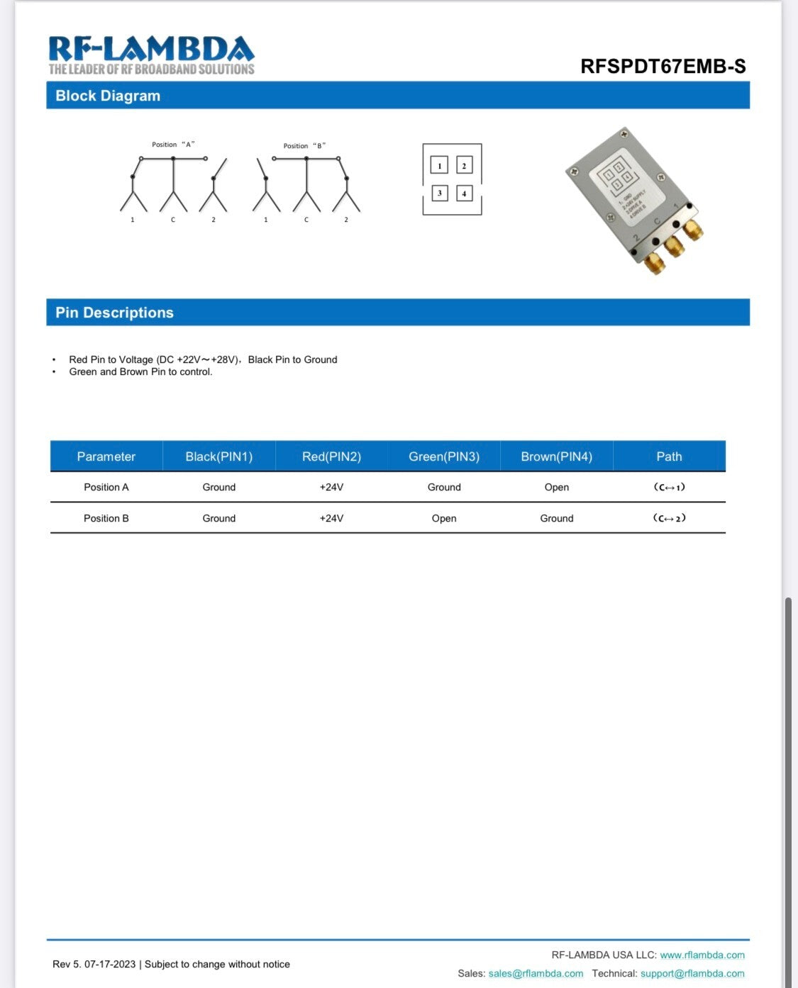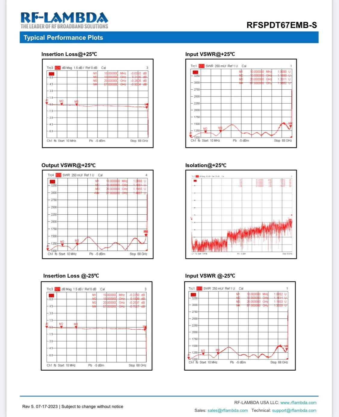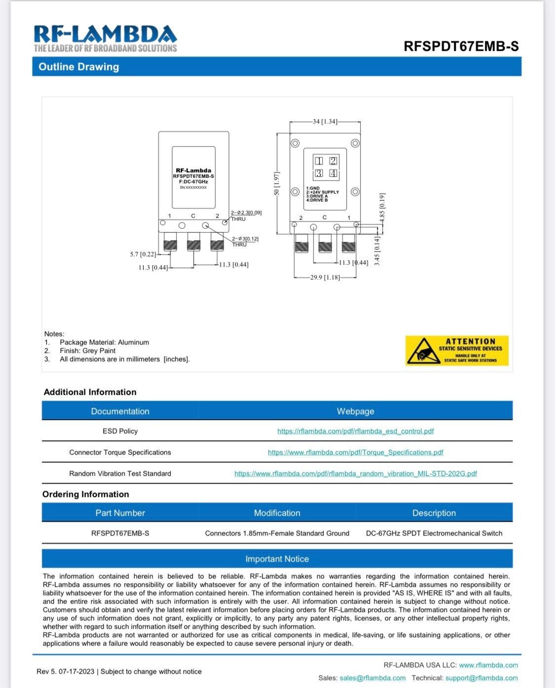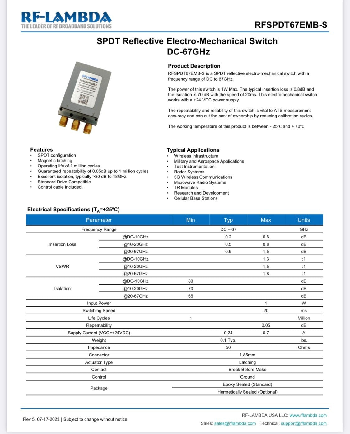 RF-LAMBDA RFSPDT67EMB-S COAXIAL RELAY SWITCH 1.85MM 67GHz 24Vdc SPDT AE1W9