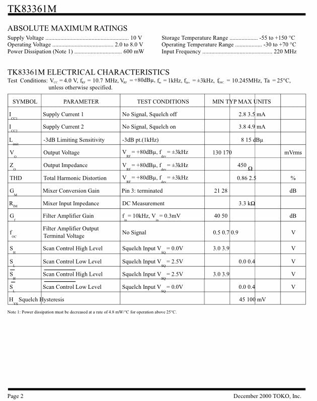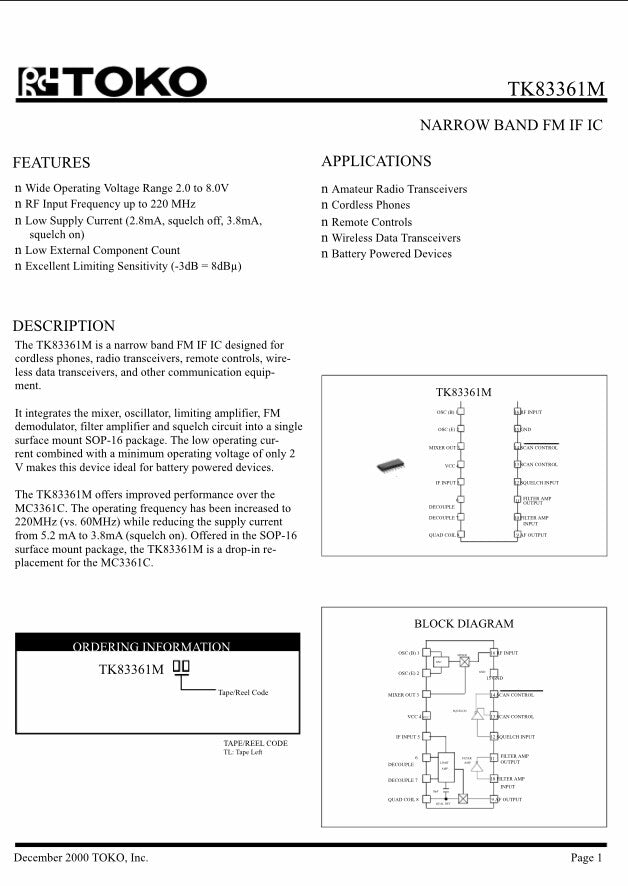 TOKO TK83361M FM IF INTEGRATION CHIP TO 220MHz SURFACE MOUNT (X1) fcb25.24