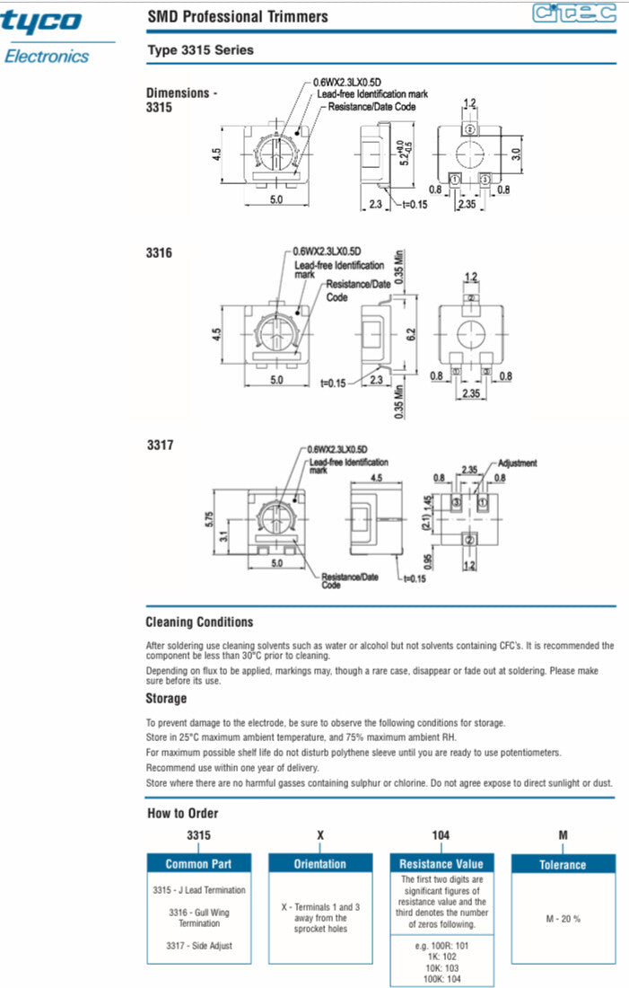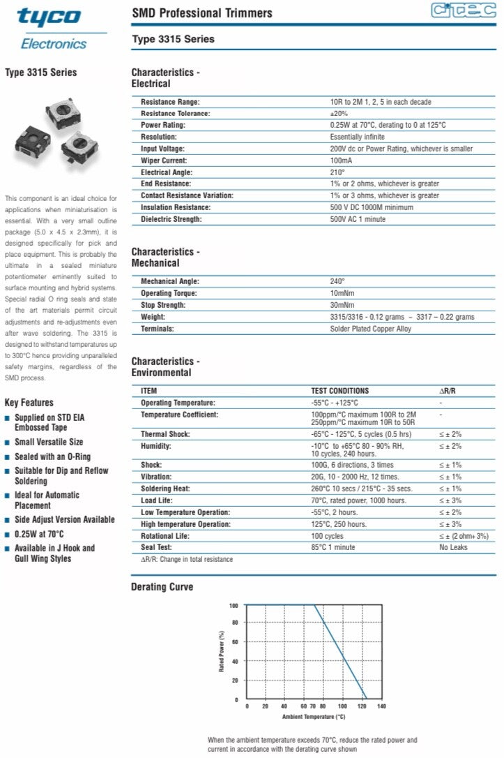 TYCO 3315X103M 10K LIN 5MM SURFACE MOUNT VARIABLE RESISTOR faa~2S